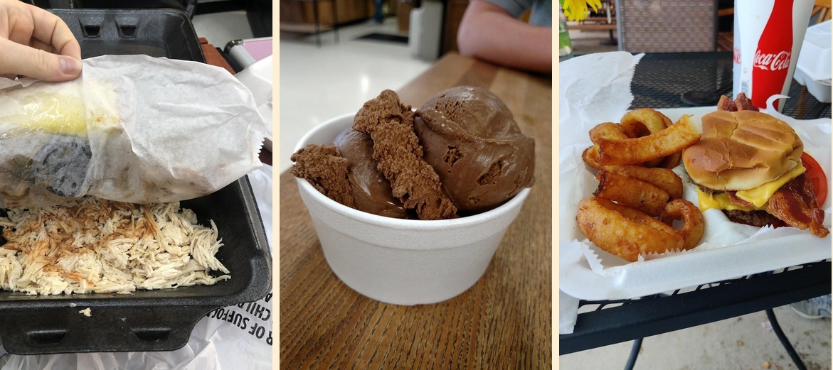 Blue Creek is well-known for its hamburgers, hot dogs, and sandwiches. The Turkey Club Sandwich and Fried Chicken Breast Sandwich attract many visitors.